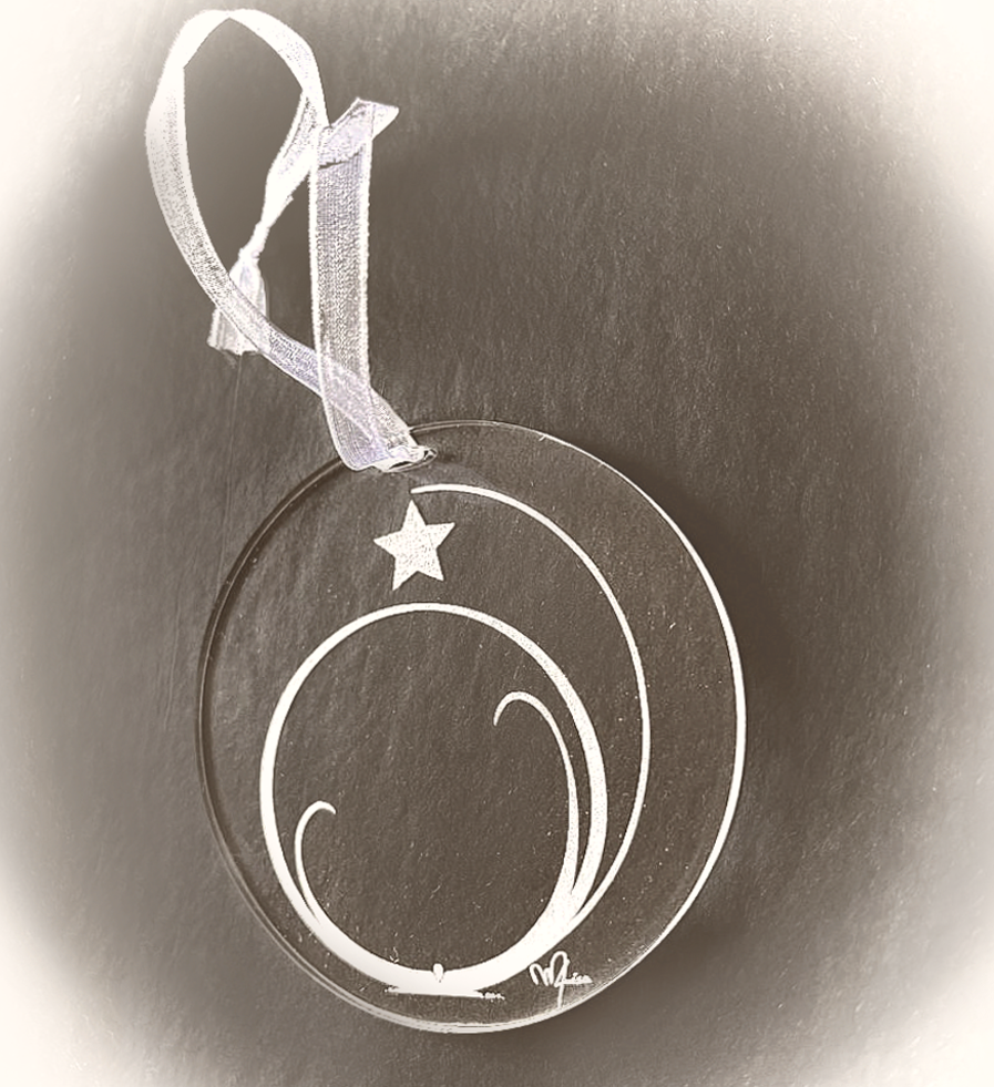 Dentro de uma bolsa em véu negro, encontra-se um medalhão em acrílico transparente gravado com a imagem do presépio, assinada pela artista e com uma fita de branco reluzente.